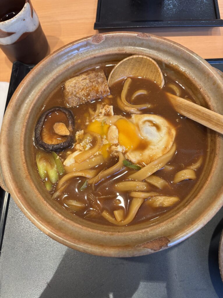 味噌煮込みうどんは、有名店である山本屋総本家さんなどは特になのですが、麺がとてもかたいのです。初めて食べる人が「まだ火が通ってないんですけど」とクレームを出すという話を聞くほどかたいのです。そしてそれが最高に美味しい!!!!大好きです。子どもの頃から大好きで小学生の時2人前食べたこともあります。このかたさととにかく濃い味噌味がたまりません。(写真の味噌煮込みうどんは鈴のれんさんのです。食べてる途中です。)