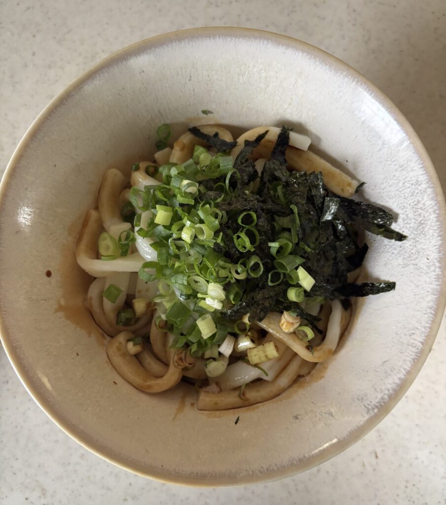 そして伊勢うどん。これは全く真逆でめちゃくちゃ柔らかいのです。どんだけ茹でたらこんなに柔らかくなるのっていう感じのうどん。実際には茹で時間ではないと思うのです。なぜなら、他のうどんを茹ですぎにしても絶対にこの伊勢うどんの食感にはならないからです。この不思議な柔らかい食感に、これまた他のうどんの汁とは全く違う真っ黒の濃いお汁をかけていただきます。このお汁とうどんの組み合わせが他のものにはない美味しさを生んでいます。伊勢うどんのお汁が余ったときに、他のうどんにかけてみたのですが、それでは全く美味しくないのです。とにかく私はこの何とも言えない柔らかい伊勢うどんも大好物なのです(この写真の伊勢うどんはスーパーで買ってきたものを自分で用意したものです)。