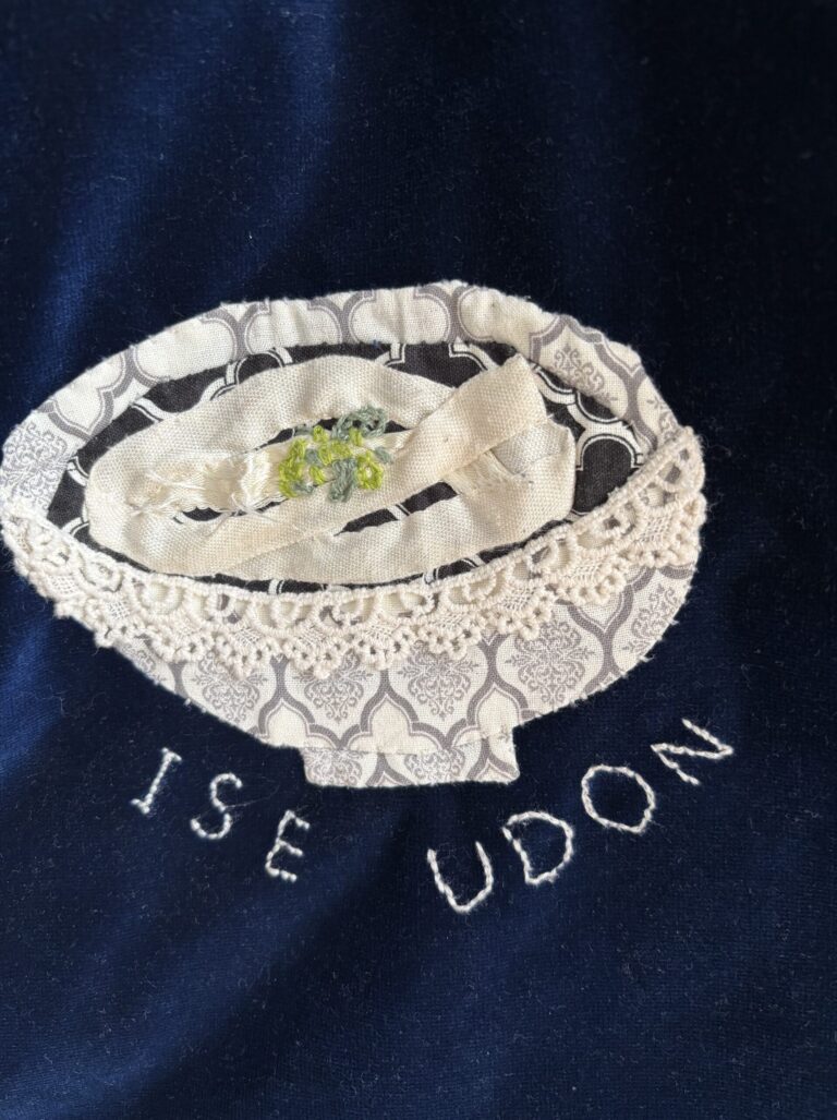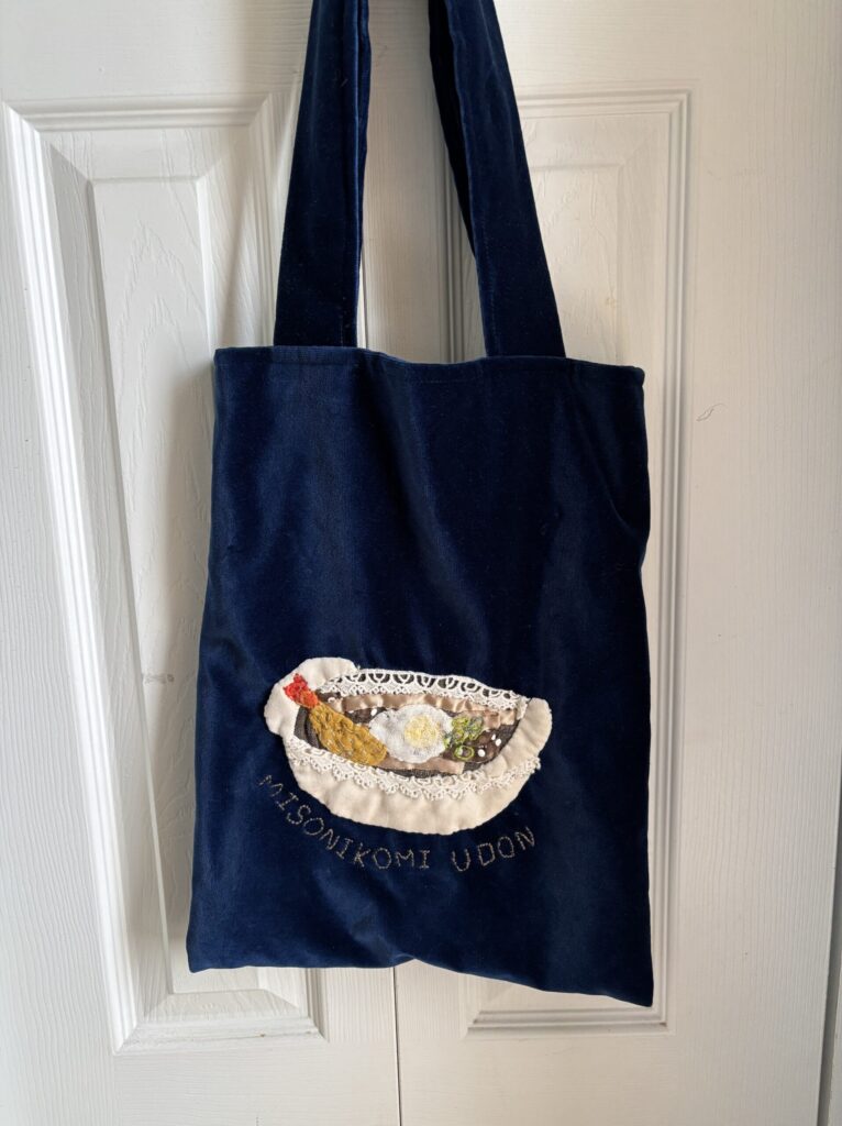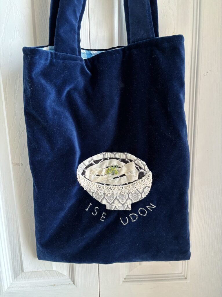 ところがところが、この二つの私の大好きなうどん、特徴が強すぎるからか苦手とする人も多いようです。ある時仲良しのお友達と4人でランチをしていた時に、なぜがこの味噌煮込みうどんと伊勢うどんの話になり、この二つのうどんが不評だったのです。ショックを受けた(笑)私はその後も気になっていろんな人に聞いてみたのですが、なかなか私と同調してくれる方がみつかりません。それで私は急にこの二つのうどんへの愛情を示さないといけないという気分になり「うどんバッグ」を作ることにしました。なんだか勢いに乗って2日間で仕上げました。裏と表です。バッグを縫うのが初めてで、縫製がめっちゃ下手くそですが・・・