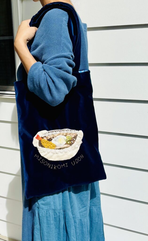 このバッグ意外と好評で、これを持って歩いていると知らない方から「うどんのバッグですか!」と声をかけられることがあって、ちょっと盛り上がってお話できるのでとっても幸せな気持ちになります。味噌煮込みうどんと伊勢うどんの話をするきっかけにもなるので、まるでショッパーのようになってます(笑)。