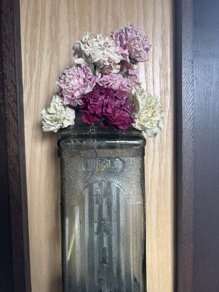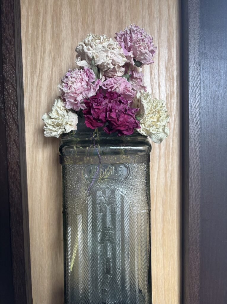 というわけで今はうちの玄関の内側に飾りとして存在しています(雨風にさらすのはちょっと勿体無いので)。現在は家で作った芍薬のドライフラワーを盛り盛りにしております。何を入れるのがいいのかなー