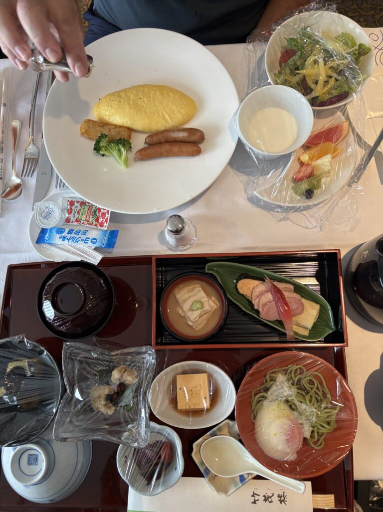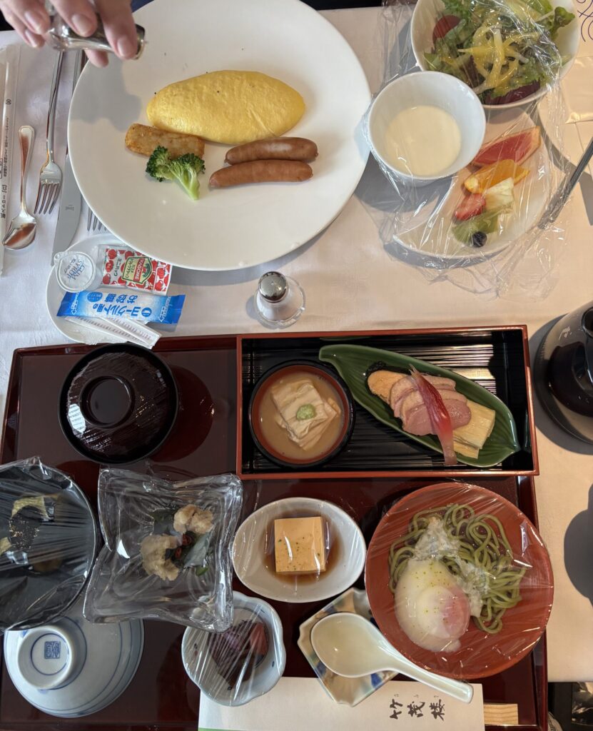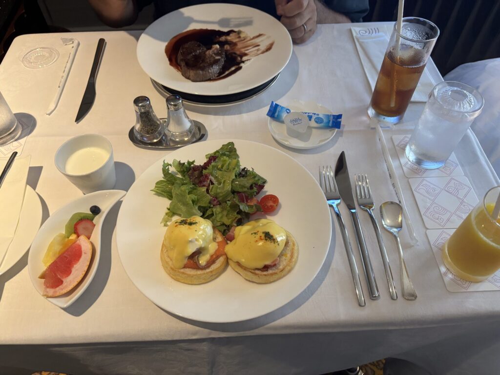 連泊したので二日目は別メニューに。エッグベネディクトとステーキにしました。ステーキは糖質を摂らず朝からタンパク質を取りたい方ようなのかなと思いました。いずれもとっても美味しかったです。エッグベネディクトの方にはさらにパンがついていて、パンオショコラやデニッシュなど全てとても美味しくって、幸せな時間となりました。二日目も慣れずドキドキでした。慣れないことってそういうものですね。