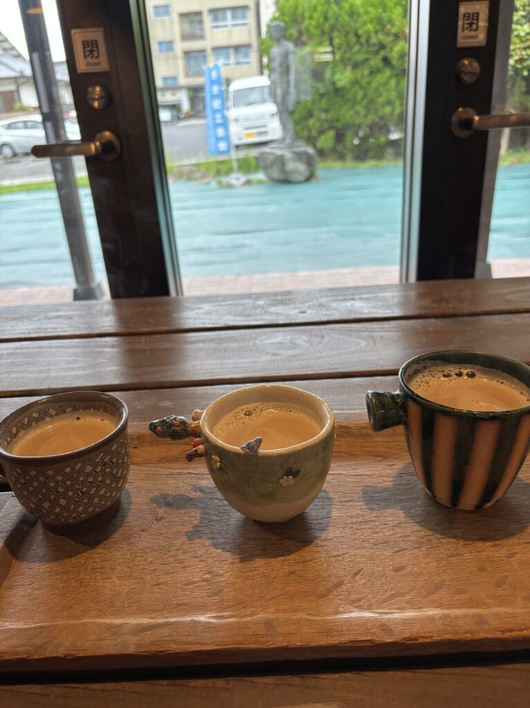 「えっ2つ!?」。お店の方がつかさず「選んでいただいたカップに規定量が入らなかったのでもう一つカップ用意しました。」と言われました。もう一つのカップも練り込みで作られて可愛い。並んでいると余計に可愛い。そしてこんなサービスしてくれるお店ってそうそうないだろうと思いました。2つのカップになるとなんだか得した気分になります。なんか倍になったみたい(実際ふたつ飲み干しておなかいっぱい)。