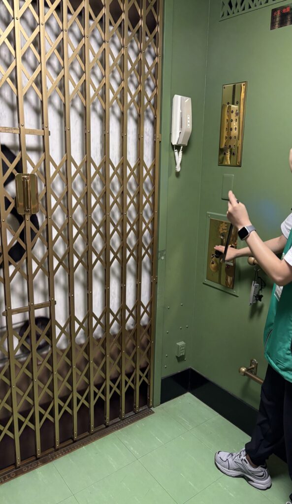 蛇腹式のドアがとても可愛く、ガタンガタンと言いながらも力強く動きます。手動で動かしており、各階に止まる時にはドアに合わせて調節しながら止めなくてはいけないようで、技術が必要なようです。