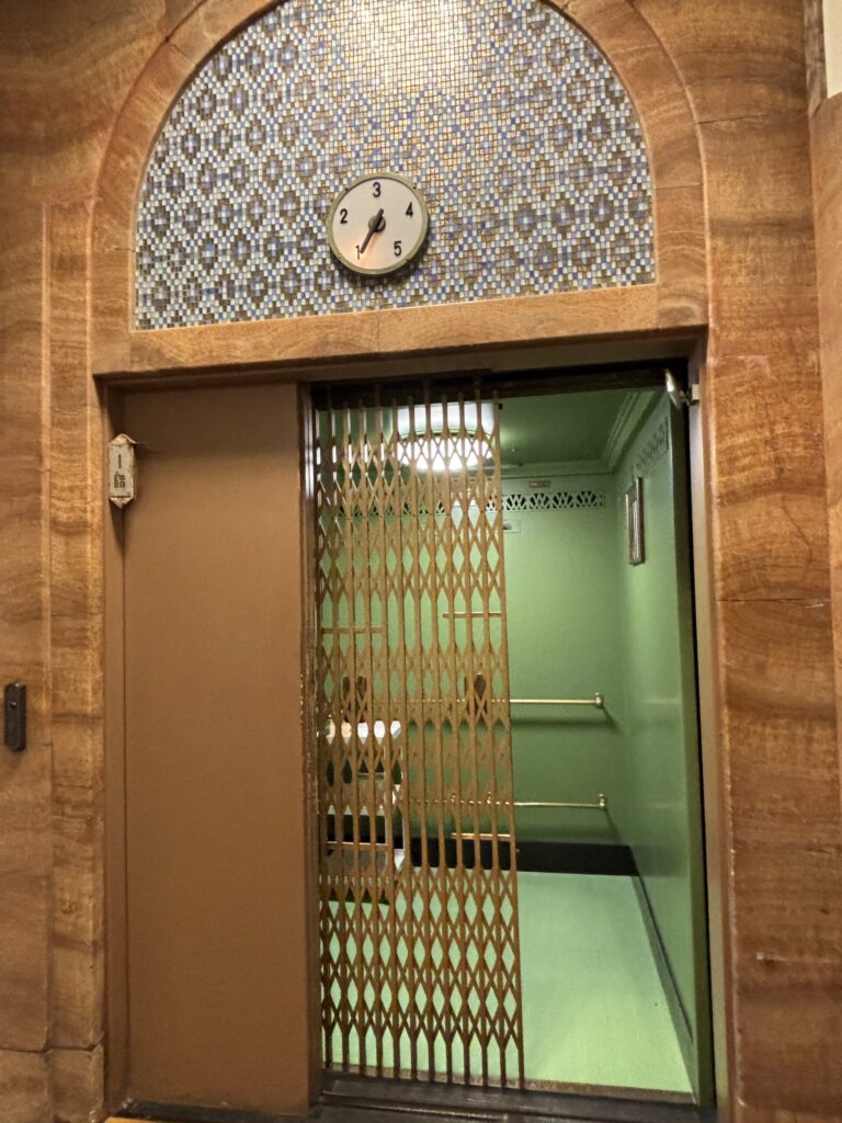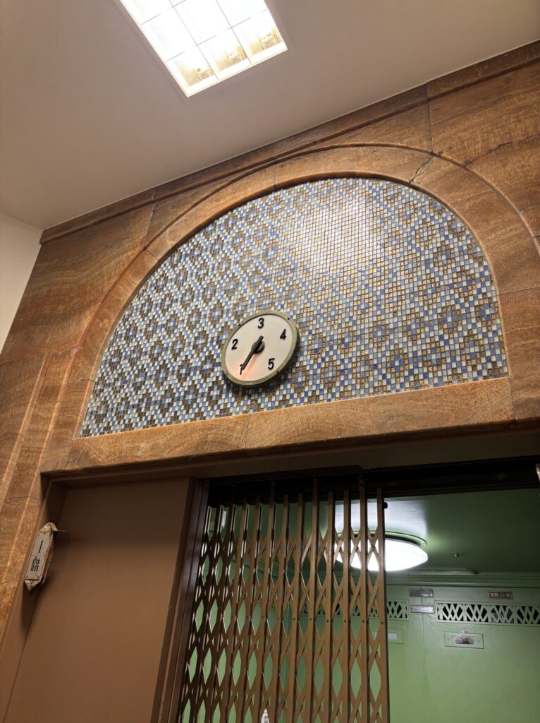 このタイルの部分がたまらなく可愛いです。この時代の凝ったデザインは本当に魅力的です。5階まで乗せていただきました。このエレベーターは全国にあと3基あるそうです。どうにかしてこれからもずっと保存してほしいと願います。