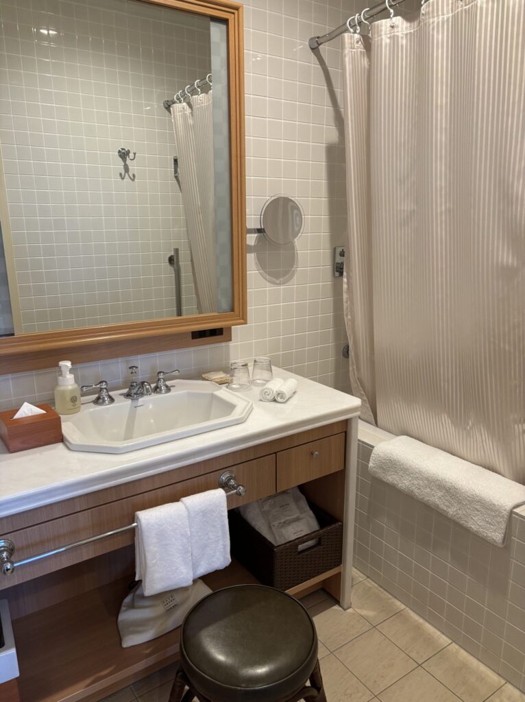 富士屋ホテルにはスパと呼ばれる大浴場があるのでそちらも二回入りましたが、実はこのお部屋のお風呂も温泉なのです。蛇口をひねればかなり熱い温泉が直接出てきます。部屋で夜遅くまで本を読んでいたらちょっと体が冷えてしまったので、温まる為にお部屋のお風呂も利用させてもらいました。洗面所も広く使いやすかったです。