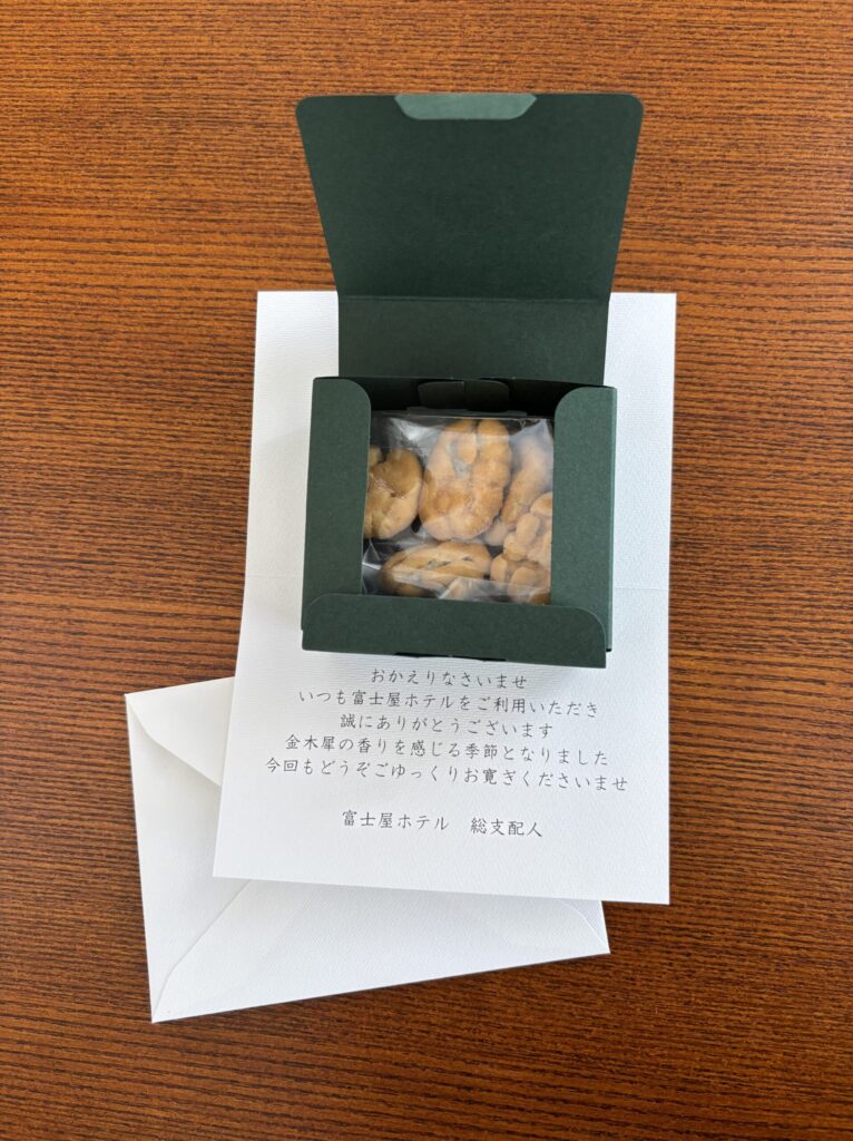 お部屋のテーブルにはお菓子とちゃんと名前を書いてくださってあるお手紙が置いてありました。とっても嬉しくなるお心遣いでした。
