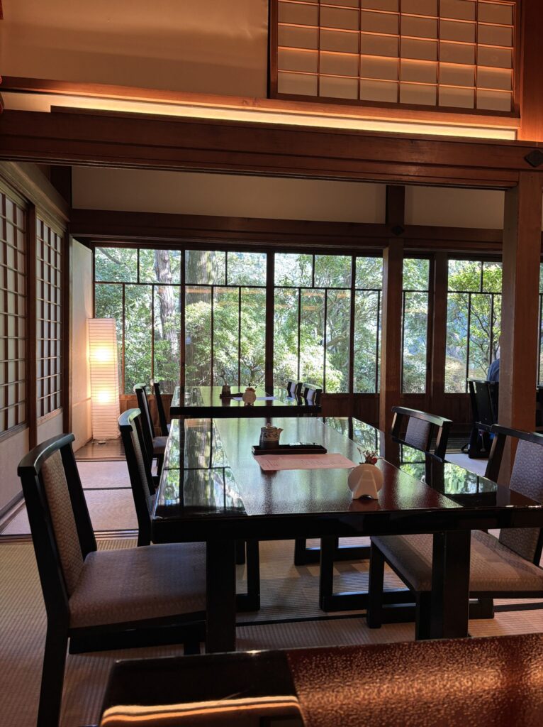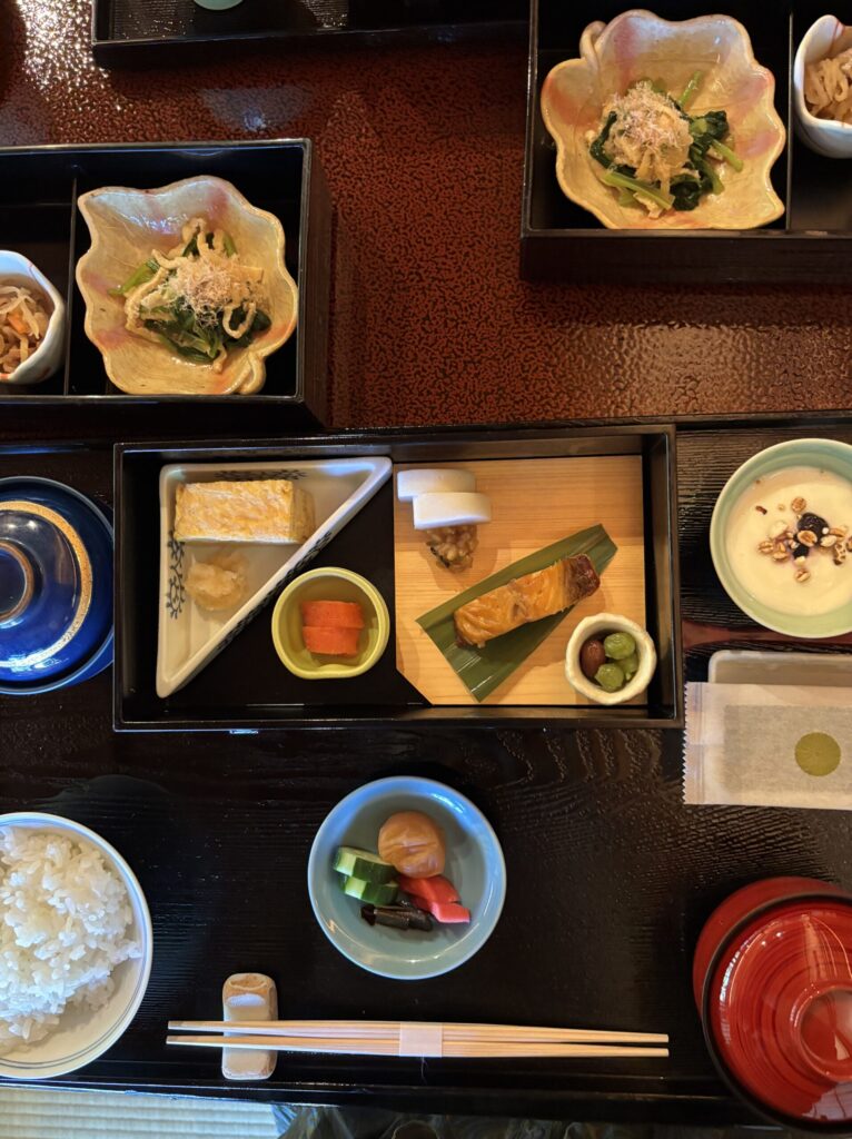 今回は朝食のみのプランで、和食をお願いしました。和食はホテルから道路を挟んだ場所にある旧御用邸 菊華荘でいただくことになります。落ち着いた雰囲気の場所で丁寧に美しく作られた和食を美味しくいただきました。