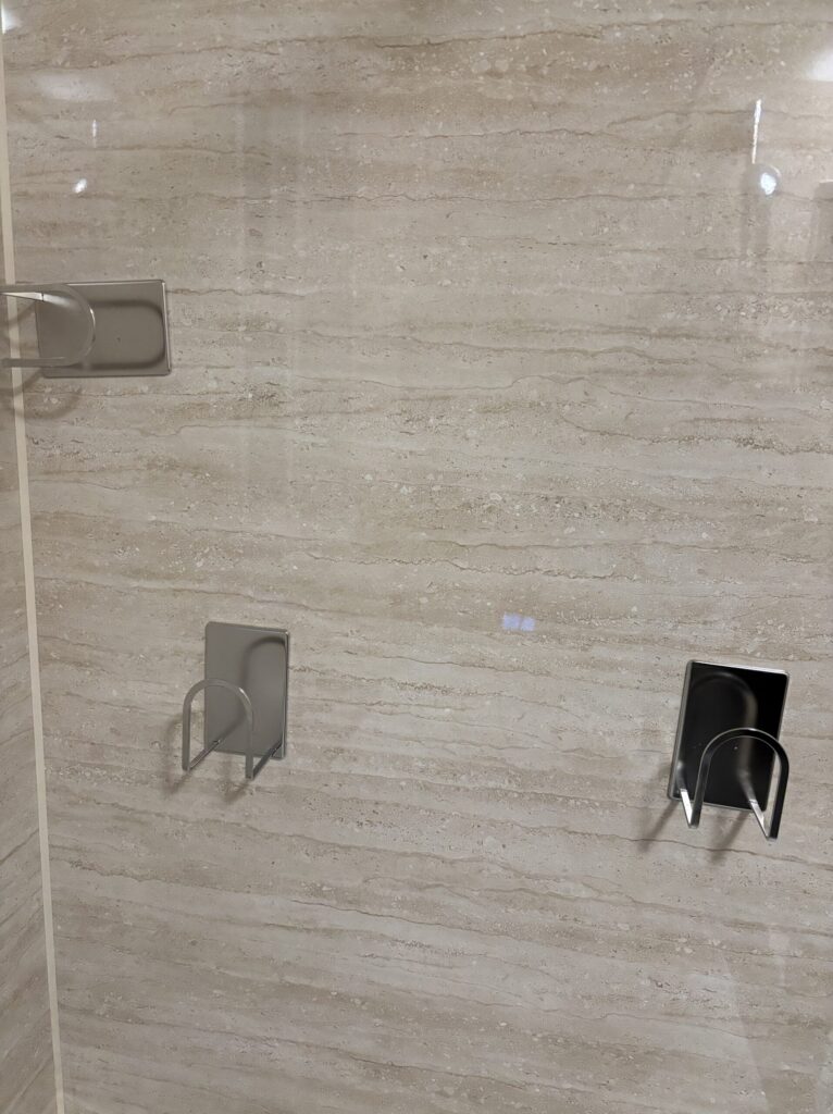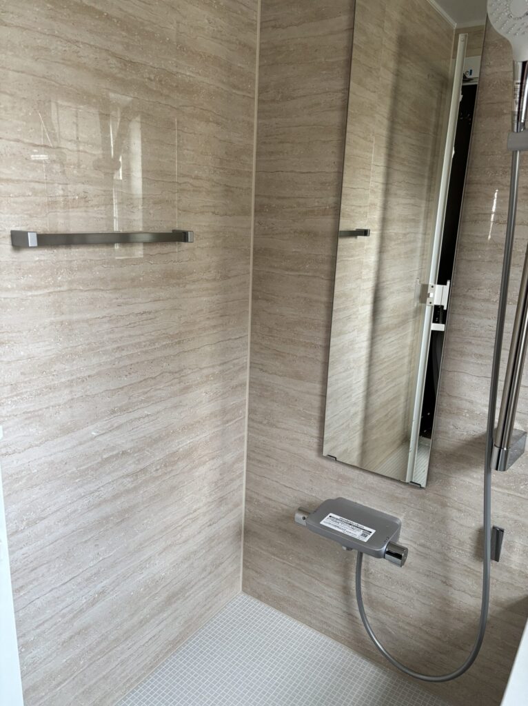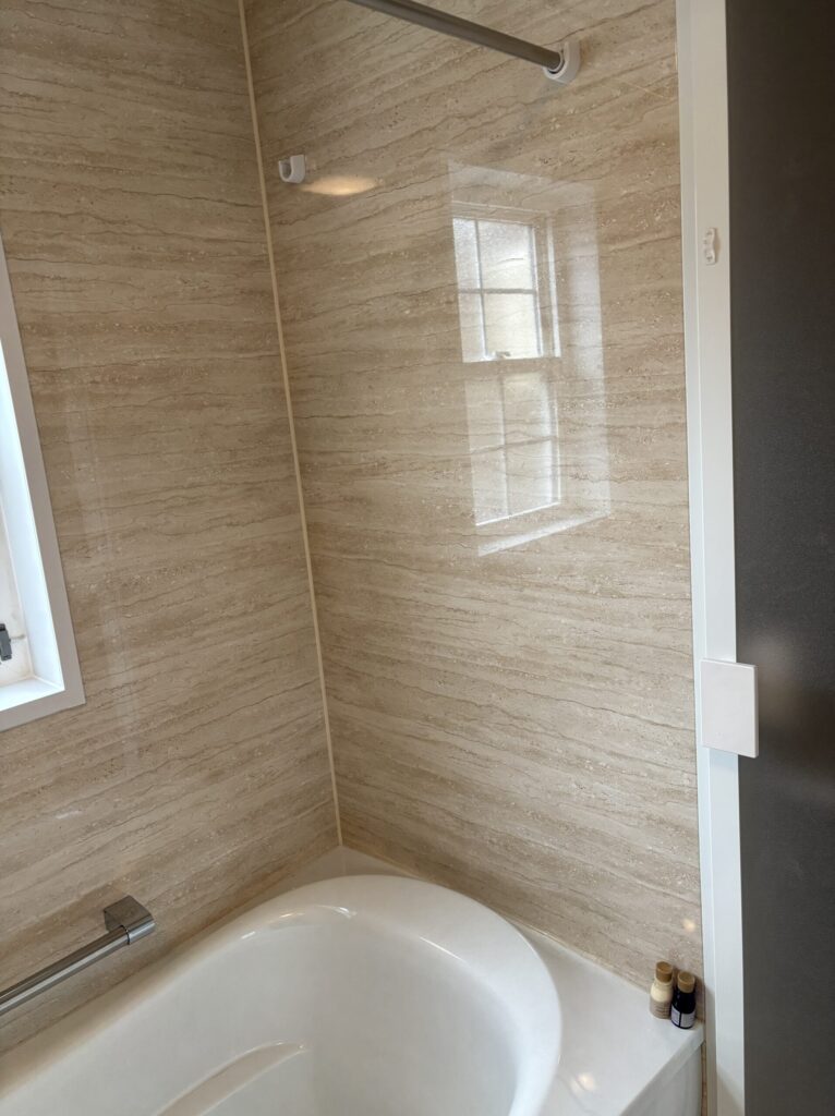お風呂の壁といえば、うちの以前のお風呂もそうでしたが、1面がアクセントになって別の色や素材の壁が入り、残りの3面がシンプルな壁になっているようなものが多いと思いますが、思い切って全部を同じ壁にしてみました。4面を同色にするのはちょっとプラス料金になるのですが、グレードが高くない方のビクストラバーチンという鏡面仕上げのものを選んだので、それほど大きな出費にならなかった印象です。そしてこの選択がすごく良かったと今でも満足しています。4面同じだとまとまったお部屋感があり落ち着きます。鏡面なので吹きやすくちょっと光っている感じがあるので清潔感があるように見えます。